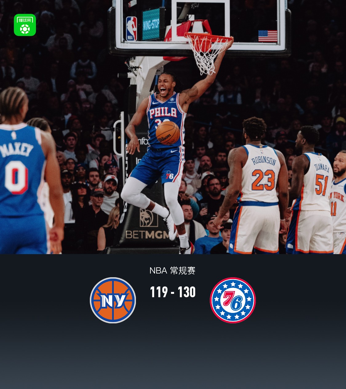 第四节尼克斯唐斯拿下12分,76人马克西拿下9分,最终尼克斯119-130不敌76人